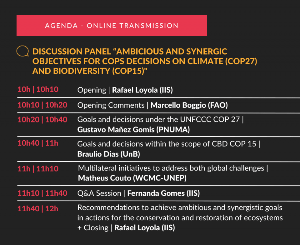 Specialists such as Marcello Boggio (FAO), Gustavo Mañez Gomis (UNEP), and Bráulio Dias (UnB) presented the opportunities and challenges discussed in both United Nations Conferences. Matheus Couto (UNEP-WCMC) pointed out multilateral initiatives to face the global challenges in both areas, and Rafael Loyola (IIS) presented a summary of recommendations for conservation actions and restoration of ecosystems to achieve ambitious and synergistic goals.